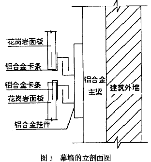 測量放線---主梁的安裝---連接構件進行加焊和防腐處理---耐火保溫棉的安裝---劃水平分格線---在主梁上安裝掛件及隔震膠條(如圖2所示)---安裝花崗巖板材---嵌縫注膠及表面清理---竣工驗收。