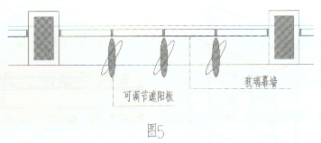 根據地區的氣候特點和房間的使用要求,可以把遮陽作為的或臨時性的。永久性的就是在玻璃幕墻內外設置各種形式的遮陽板和遮陽簾,臨時性的就是在玻璃的內外設置輕便的布簾,竹簾,軟百頁,帆布蓬等。在永久性的遮陽設施中,按其構件能否活動,有可分為固定式或活動式兩種。活動式的遮陽可視一年中季節的變換,一天的時間變化和天空的陰晴情況,任意調節遮陽板的角度;在寒冷的季節,可以避免遮擋陽光,爭取日照。(見圖5)這種遮陽設施的靈活性大,使用合理,因此近年在國外的建筑中應用較廣。