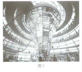 遮陽系統能夠實現節能的目的,需要靠它的智能控制系統,這種智能化控制系統是一套較為復雜的系統工程,是從功能要求到控制模式到信息采集到執行命令到傳動機構的全過程控制系統。它涉及到氣候測量、制冷機組運行狀況的信息采集、電力系統配置、樓宇控制、計算機控制、外立面構造等多方面的因素。智能遮陽系統的節能功效可以在設計階段就能被計算機推導軟件容易并可靠地計算出來。(圖7為德國柏林議會新穹頂,其遮陽葉板由計算機控制隨太陽移動)。