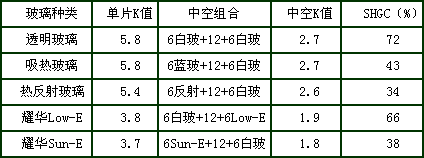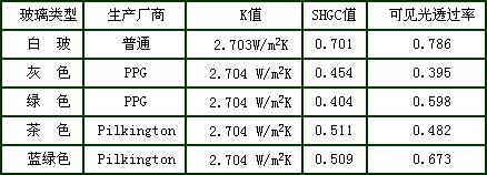 輻射率都與普通白玻相同,約為0.84。所以在相同厚度的情況下,組成中空玻璃時傳熱系數K值是相同的。選取不同廠商的幾種有代表性的6mm厚度吸熱玻璃,中空組合方式為吸熱玻璃+12mm空氣+6mm白玻,表1列出了各項節能特性參數。計算結果表明,吸熱玻璃僅能控制太陽輻射的熱量傳遞,不能改變由于溫度差引起的熱量傳遞。