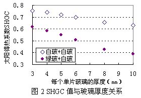 當玻璃厚度增加時,太陽光穿透玻璃進入室內的能量將會隨之而減少,從而導致中空玻璃太陽得熱系數的降低。如圖2所示,在由兩片白玻組成中空時,單片玻璃厚度由3mm增加到10mm,SHGC值降低了16%;由綠玻(選用典型參數)+白玻組成中空時,降低了37%左右。不同廠商、不同顏色的吸熱玻璃影響程度將會有所不同,但同一類型中,玻璃厚度對SHGC值的影響都會比較大,同時對可見光透過率的影響也很大。所以,建筑上選用吸熱玻璃組成的中空玻璃時,應根據建筑物能耗的設計參數,在滿足結構要求的前提下,考慮玻璃厚度對室內獲得