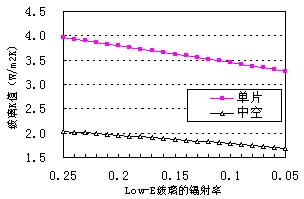 Low-E玻璃的傳熱系數與其膜面的輻射率有著直接的聯系。輻射率越小時,對遠紅外線的反射率越高,玻璃的傳熱系數也會越低。例如,當6mm單片Low-E玻璃的膜面輻射率為0.2時,傳熱系數為3.80 W/m2K;輻射率為0.1時,傳熱系數為3.45 W/m2K。單片玻璃K值的變化必然會引起中空玻璃K值的變化,所以Low-E中空玻璃的傳熱系數會隨著低輻射膜層輻射率的變化而改變。圖3所示的數據為白玻與Low-E玻璃采用6+12+6的組合時,中空K值受膜面輻射率變化的情況?梢钥闯觯斴椛渎蕪0.2降低到0.1時,K值僅降低了0.17 W/m2K。這說明與單片Low-E的變化相比,Low-E中空的K值變化受輻射率的影響不是非常顯著。