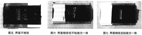 有機硅油后,使得硅酮膠中的礦物油隨著時間的推移,逐漸向丁基膠中遷移,溶解了丁基膠中的基礎原料,因而指觸丁基/硅酮接觸面有粘手黑的物質即為溶解了的丁基膠(見圖五》;二是丁基/硅酮中空玻漓密封膠接觸面相容但不粘接為一體,丁基膠、硅酮膠各自為相,兩者分離面光滑(見圖六),目前市售硅酮膠與丁基膠的接觸面多數屬此情況;三是丁基/硅酮中空玻璃密封膠接觸面相容且粘接為一體,剝離破壞不是從兩者界面處破壞,而是從強度較弱的丁基膠處破壞(見圖七)。