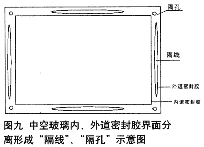聚合物如硅酮膠、聚硫膠等中空玻漓密封膠來完成,主要起粘接作用。因此,這就決定了第一道丁基中空玻璃密封膠耐風壓和杭其它外力作用的能力極其小,而且由于丁基中空玻瑞密封膠是熱熠性膠,其鉆接強度隨溫度的升高而降低很多。而中空玻瑞安裝在建筑外墻上,勢將承受振動、風壓、日照、雨雪、高低溫度及大氣壓力的交變循環作用,必然拉動中空玻璃單元件膠粘接縫位移。假若丁基膠與硅酮膠或聚硫膠兩相界面間僅緊密接觸但不是粘接為一體,在上述情況下丁基膠極易與外道密封膠脫離,從而在中空玻璃邊上形成“隔線”,在中空玻璃夾角處形成“隔孔”(見圖八),又由于外遭密封膠的阻擋水氣,空氣的能力遠遠小于丁基膠,久而久之,在丁基膠與硅酮膠脫離處的“隔線”“隔孔”相當于外界大氣壓,此時,“硯線”“隔孔”處中空玻瑰相當于雙重“單道密封”,內道只有丁基膠的“單道密封”,此時的丁基膠既要起密封作用,也要起結構粘接作用,而結構鉆結作用恰恰是丁基膠的弱點;外道只有硅酮膠載聚硫膠的“單道密封”,其阻隔水氣的能力無法與丁基膠比擬。中空玻漓的密封失效往從兩者中的弱點處開始,假若丁基膠與外道密封膠兩相界面間緊密粘接為一體.在外力作用下,丁基膠憑借外道密封膠優良的粘接