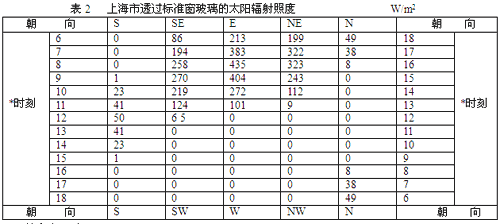 窗玻璃的太陽輻射照度(W/m2)見表2。