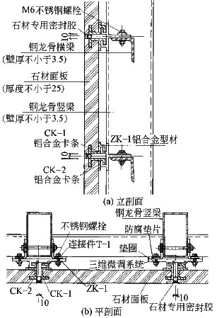 干掛石材幕墻的設計方法、加工方法、安裝方法、物理性能等都得到了徹底改變。小單元干掛法典型節點如圖3所示。