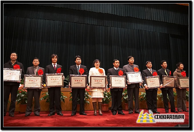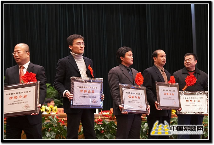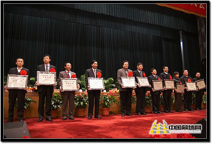 圖十七 建筑幕墻類 獲獎(jiǎng)企業(yè)廣州白云、北京江河、深圳三鑫企業(yè)代表上臺(tái)領(lǐng)獎(jiǎng)