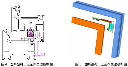三維模擬即構(gòu)成門窗的型材、五金件、玻璃等做成三維圖形,利用三維軟件的功能進(jìn)行三維組裝模擬。其優(yōu)點(diǎn)是立體感強(qiáng),能夠在組裝過(guò)程中直接檢查零件的干涉現(xiàn)象。如圖5所示的是一個(gè)三維模擬情況。但三維模擬也有缺陷,一是對(duì)安裝后變形的產(chǎn)品如膠條等無(wú)法進(jìn)行識(shí)別,既使可行也特別復(fù)雜,這部分還是要靠試驗(yàn)得出結(jié)論。二是三維模擬較復(fù)雜,對(duì)人員素質(zhì)水平要求高,計(jì)算機(jī)配置要求也較高。對(duì)一般企業(yè)采用二維模擬設(shè)計(jì)即可。