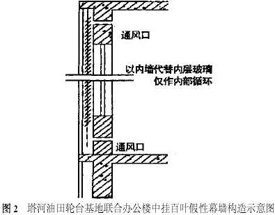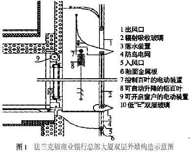 遮陽的綜合改進(jìn)。由于太陽直射對(duì)建筑的冷熱負(fù)荷有直接影響,冬季的陽光進(jìn)入室內(nèi),夏季遮陽都能有效地控制負(fù)荷總值。但傳統(tǒng)建筑中的百葉或掛于室內(nèi),難以高效控制已入室內(nèi)的熱量;或懸于室外,不能形成循環(huán)通風(fēng)道,或多或少地對(duì)建筑節(jié)能有一定的負(fù)面影響。中掛百葉是幕墻改革的一個(gè)較好方案,法蘭克福商業(yè)銀行總部大廈[2 ] 是其中一個(gè)較好的例子,見圖1。這種百葉幕墻解決了適時(shí)調(diào)節(jié)百葉的角度,以最佳狀態(tài)達(dá)到節(jié)能的目的。