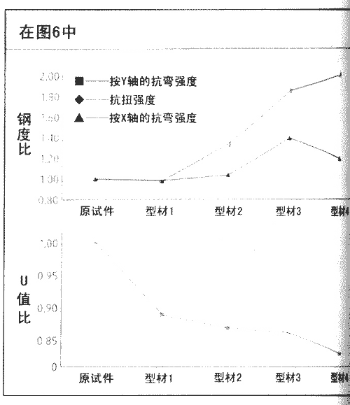 圖6 對各型材分別優化后的熱工性質(U值)及力學強度,圖中數安指標為對原試樣的相對值