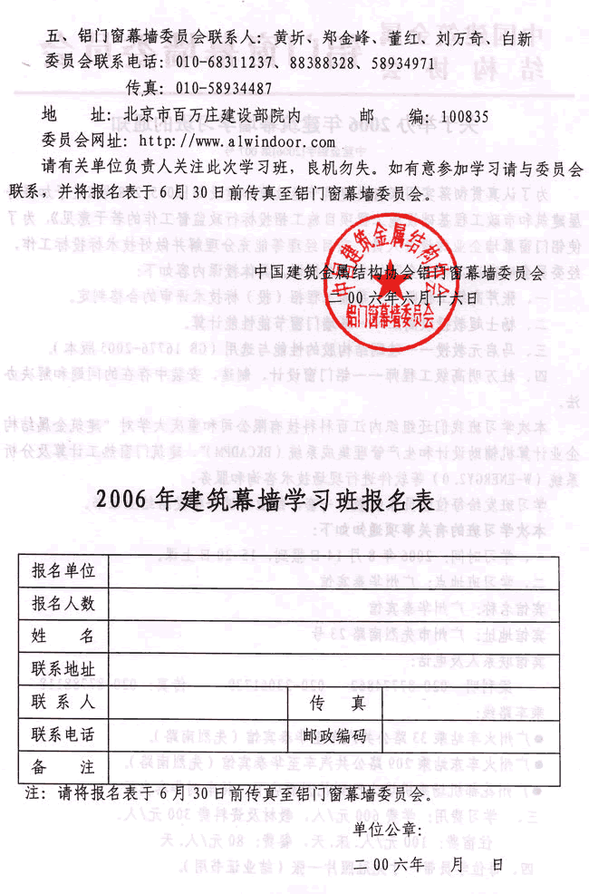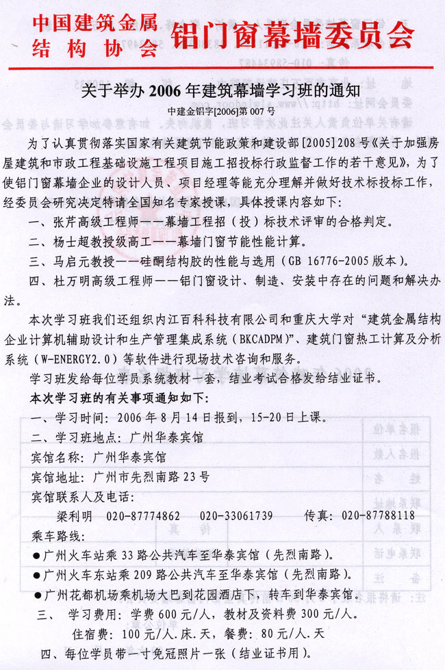 關于舉辦2006年建筑幕墻學習班的通知 附表下載