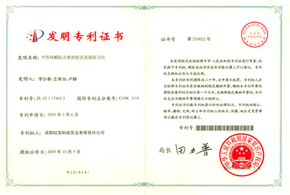 防火材料產品質量監督檢驗中心”的檢測,防火級別達到FV-O級,是最高的防火級別,是國內首創產品,技術水平國內領先。2005年硅寶119中性硅酮防火密封膠獲得國家發明專利。