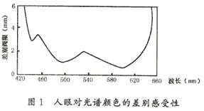 人眼對(duì)光譜不同波長(zhǎng)的顏色判別感受性是有區(qū)別的,如圖1所示。