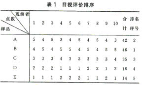 在圖中可以看到在495nm、600nm一帶,視覺(jué)的辨色能力很高,只要有1nm波長(zhǎng)的改變便被察覺(jué)出來(lái),而在430nm和650nm一帶的辨色能力很低,Δλ須達(dá)到5~6nm方能感覺(jué)出顏色的差別,因此視力正常的人在辨色能力上是有微小的差異的,但多個(gè)觀察者的平均值,其結(jié)果比較可靠。我們?yōu)榇诉x用了10名觀察者對(duì)所制作的樣品進(jìn)行了目視評(píng)價(jià)。樣品最白者為5點(diǎn),第二為4點(diǎn),依次類推,將各樣品點(diǎn)數(shù)相加,得出點(diǎn)數(shù)最多者為最白樣品,測(cè)試結(jié)果如表1。