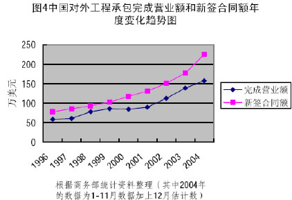 中國對外承包工程自改革開放以來快速發展,完成營業額從1985年的6億多美元增加到2003年的138億多美元。(見圖4)2001年后我國對外承包工程完成營業額和新簽合同額增長速度有明顯加快的趨勢。2004年,在海外華人的安全形勢惡化,阿富汗和巴基斯坦出現針對中國工程人員的恐怖襲擊,中國對外承包工程企業面臨著前所未有的挑戰的形勢下,中國對外工程承包企業克服不利影響,仍然取得驕人成績。2004年1-11月,我國對外承包工程完成營業額144.8億美元,同比增長28.8%;新簽合同額208.6億美元,同比增長44.3%,首次突破200億美元大關。截至2004年11月底,我國對外承包工程累計完成營業額1110.4億美元,合同額1533.1億美元。