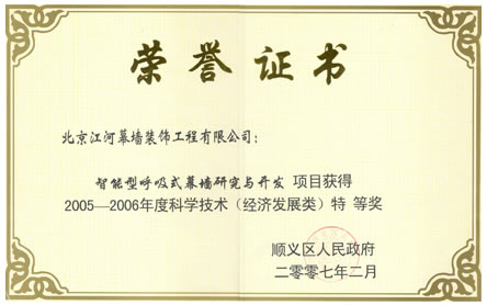 5月15日,順義區(qū)2007年科技工作大會在順義賓館勝利召開,江河公司“智能型呼吸式幕墻研究與開發(fā)”喜獲經(jīng)濟發(fā)展類項目成果科學(xué)技術(shù)特等獎,該獎項是順義區(qū)自舉辦科技大會以來,首次頒發(fā)的唯一特等獎獎項。江河公司副總裁