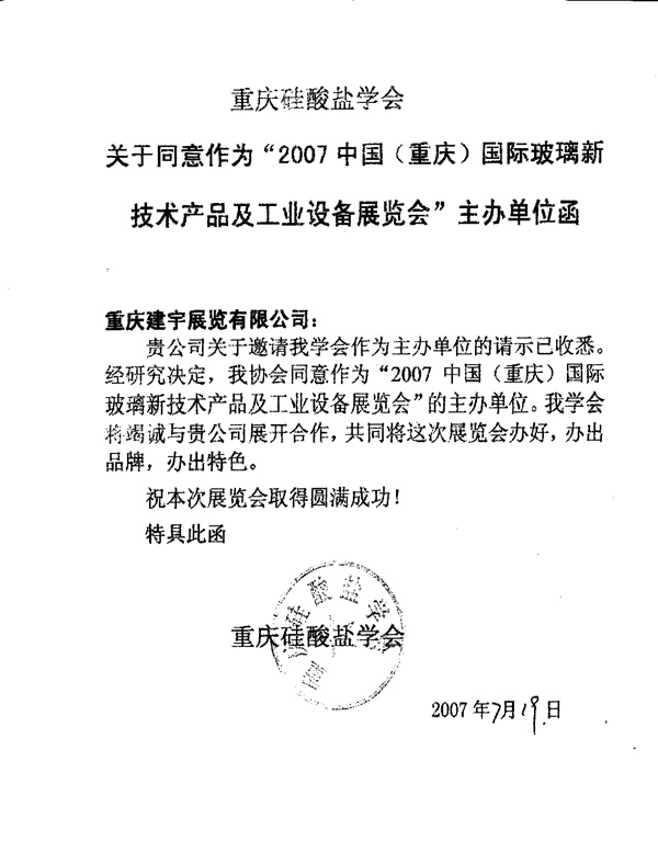 關于“2007中國(重慶)國際玻璃新技術產品及工業設備展”批準函