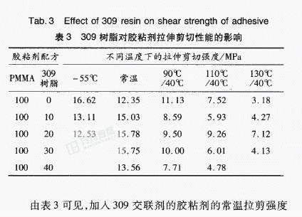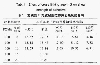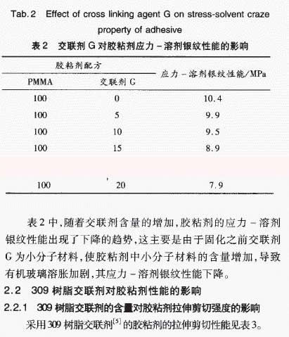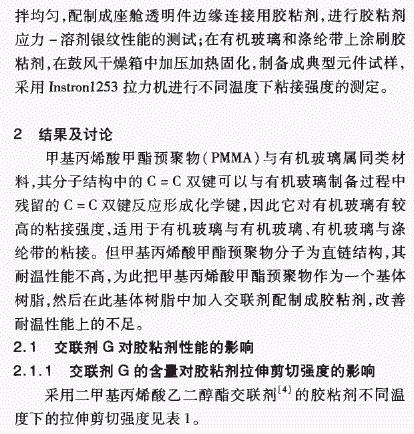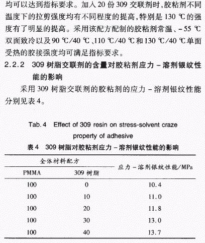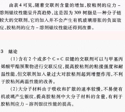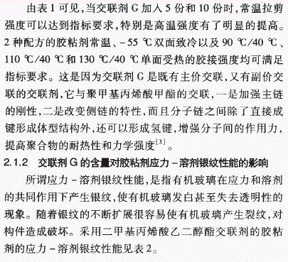 摘要:選 用甲基丙烯酸甲醋預聚物作為主體樹脂,通過交聯(lián)劑種類及含量對膠粘劑拉伸剪切強度應力溶劑銀紋性能影響的研究,研制出一種耐熱性能滿足使用要求的丙烯酸醋膠粘劑。試驗結果表明,適量的交聯(lián)劑有利于提高膠粘劑的耐溫性能,但交聯(lián)劑加入量過大對膠粘劑起到增塑作用,反而不利于膠粘劑高溫性能的改善。高分子材料由于吸收和擴散的速度較慢,不易使有機玻璃產生銀紋,提高膠粘劑中高分子材料的含量,有利于膠粘劑應力一溶劑銀紋性能的提高。