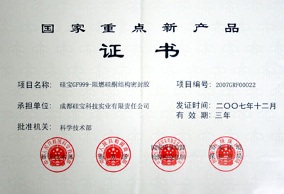熱烈祝賀硅寶GF999-阻燃硅酮結構密封膠獲國家重點新產品證書