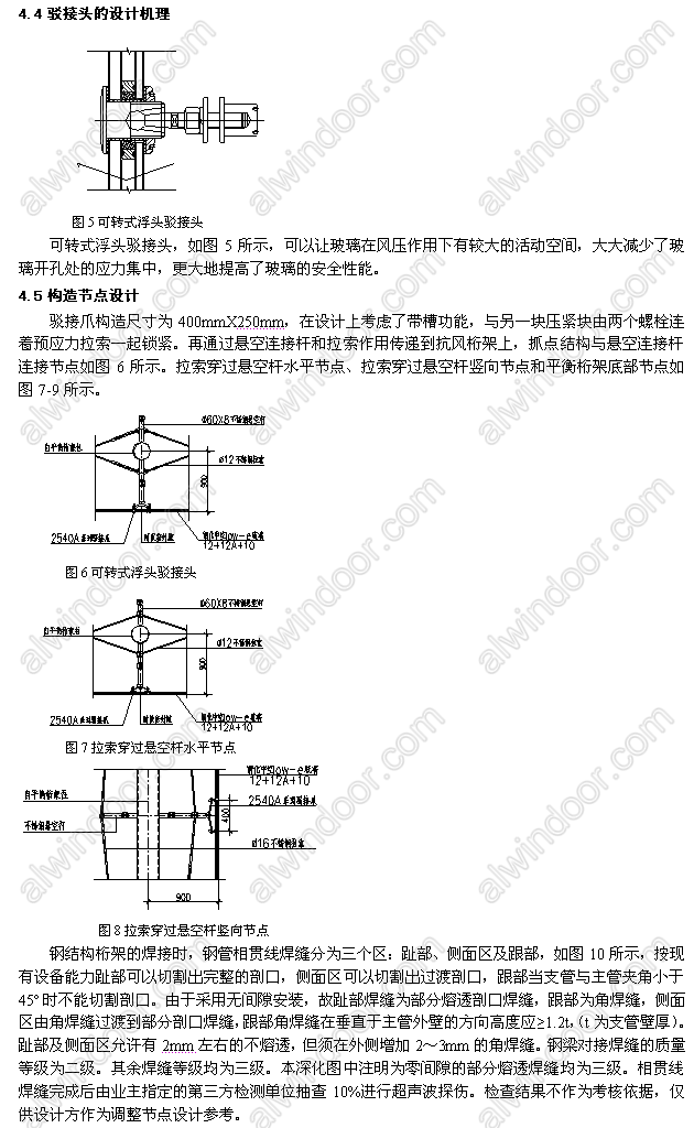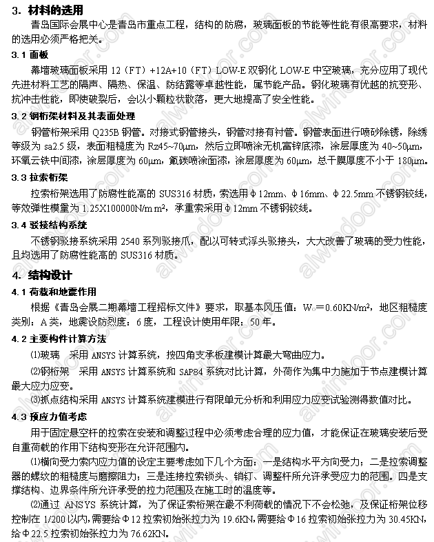 玻璃幕墻結(jié)構(gòu)中較為先進支承結(jié)構(gòu)形式 的工程應(yīng)用展開了具體的討論,包括材料選用、結(jié)構(gòu)設(shè)計、節(jié)點設(shè)計及構(gòu)造、結(jié)構(gòu)檢測、玻璃幕墻檢測和結(jié)構(gòu)施工等,涵蓋了這兩種結(jié)構(gòu)形式工程應(yīng)用的各個方面,為今后這類工程結(jié)構(gòu)的設(shè)計和施工提供了依據(jù)。