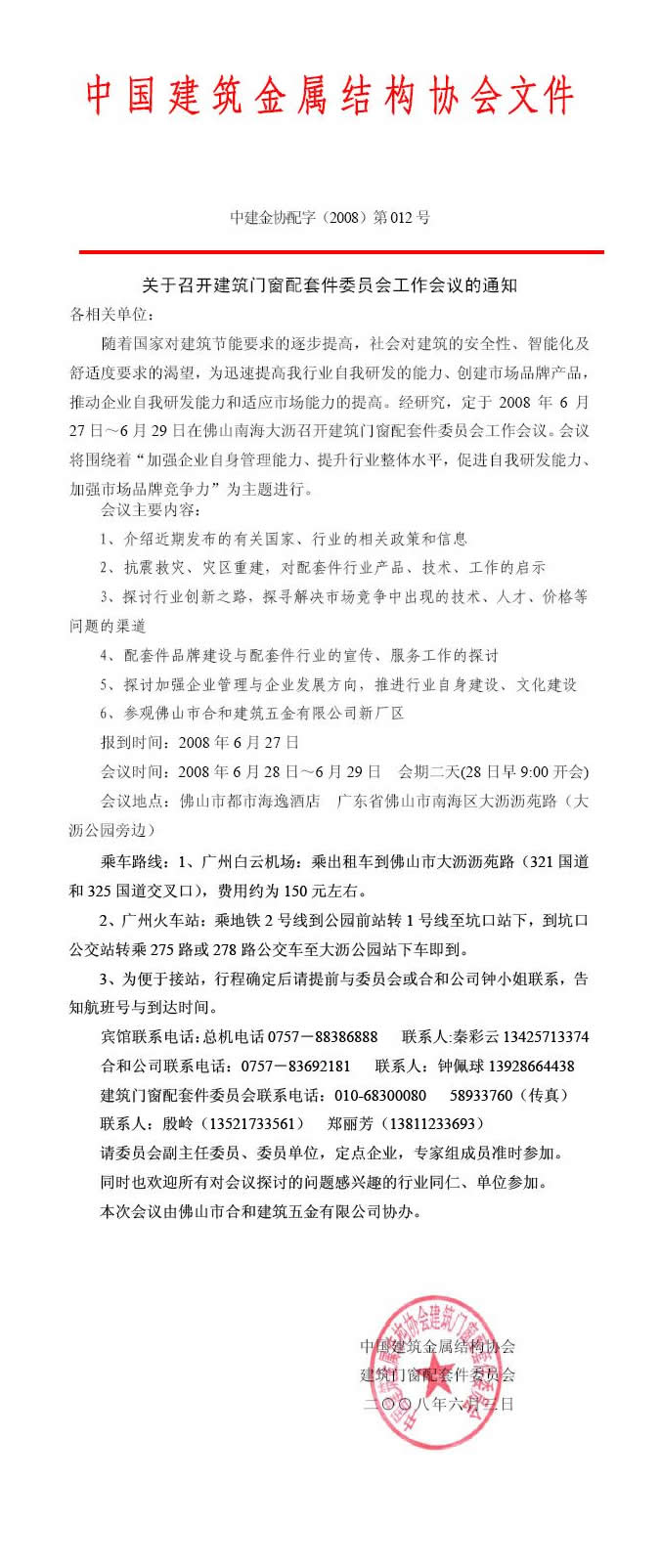 關(guān)于召開建筑門窗配套件委員會工作會議的通知