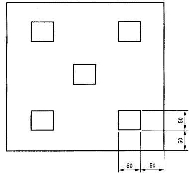 在一片玻璃的四角和正中間取 50 mm X 50 mm的試樣五小片,試樣外邊緣距該玻璃邊緣 50m(如圖 1所示),以中間作為標準片,其余四片均與該片進行透射顏色的比較,分別測得 4個 △E﹡ab值,4值中的最大值應符合表 2的規定。