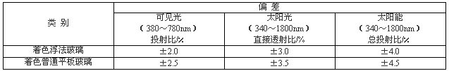 著色浮法玻璃、著色普通平板玻璃的可見光透射比、太陽光直接透射比、太陽能總透射比允許偏差值應符合表1的規定。