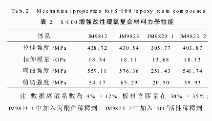 伸長率分別為2.10%和1.64%,酸酐固化體系的韌性較好,而其它的力學性能均低于間苯二胺固化體系。由表2看到,S100/JM9823體系復合材料的剪切強度明顯高于S100/JM9812體系復合材料。但是該體系的工藝性較差,為改善JM9823體系的工藝性,分別加入活性和非活性稀釋劑調節黏度,使體系工藝性得到一定程度的改善,但力學性能下降,尤其JM9823.1的強度下降了30%.~65%。這可能是膠層中有殘留的稀釋劑所導致。