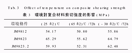 無堿玻璃纖維織物(EW200)增強JM9812、JM9823體系的復合材料試樣,在(-30±2)℃、(65±2)℃,RH60%條件下恒溫72h,測得的剪切強度試驗結果見表3。由表3可見,3種復合材料在60~70℃的剪切強度比常溫條件下低,但強度仍保持在80%以上,尤其是JM9812體系相對室溫強度保留率為93.78%。這說明復合材料耐溫性好。主要是由于