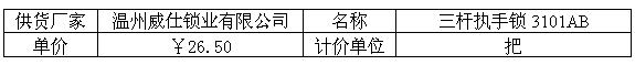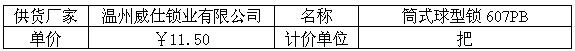 溫州威仕鎖業(yè)有限公司是一家專業(yè)從事五金鎖具(機(jī)械門鎖)的開發(fā)\制造\銷售為一體的公司,公司擁有先進(jìn)的生產(chǎn)設(shè)備、高素質(zhì)管理人才和雄厚的技術(shù)開發(fā)力量。生產(chǎn)各類中高檔筒式、三柱式球型門鎖,筒式、三柱式執(zhí)手鎖,輔助門鎖等。產(chǎn)品經(jīng)國家鎖具檢測中心檢驗(yàn)為合格產(chǎn)品。產(chǎn)品款式新穎、豪華、品種繁多、外型典雅。產(chǎn)品遠(yuǎn)銷東南亞、歐美等國家和地區(qū)。 產(chǎn)品展示: 產(chǎn)品說明: 筒式球型鎖 簡述 * 筒式球型鎖適于家居住宅使用,易于安裝而且經(jīng)濟(jì)實(shí)惠。 * 開合壽命保障100,000次。 * 表面電鍍起抗腐蝕作用。 * 外飾件均采用不銹鋼或鐵電鍍材料。 特點(diǎn) 鎖舌體 * 門鎖功能為保險(xiǎn)舌設(shè)計(jì)。 * 配置60mm/70mm(2-3/8"/2-3/4")鎖舌可選。 * 配置57mm(2-1/4")圓形彎唇扣板。 適裝門厚 * 適用于35mm(1-3/8")到45mm(1-3/4")的門厚。 * 左開門或右開門均適用。 聯(lián)系人: 侯宗國 地 址: 浙江溫州市龍灣區(qū)永興街道環(huán)鎮(zhèn)南路27號 電 話: 0577-86925133 您有好的產(chǎn)品要推薦給大家嗎?您想讓更多的人了解您的產(chǎn)品嗎?中國門窗&配套材料網(wǎng)幫您實(shí)現(xiàn)這個(gè)愿望。只要您為我們提供相關(guān)的企業(yè)及產(chǎn)品信息,我們將免費(fèi)為你在中國門窗&配套材料網(wǎng)和中國幕墻網(wǎng)同時(shí)發(fā)布。中國門窗&配套材料網(wǎng)編輯:唐 甜 TEL:010-63642366 QQ:564241783