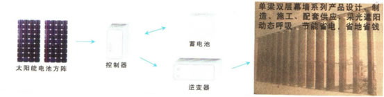 為使產品再提升,開拓新能源,研制成功了體積小、功率大,可串聯布陣,也可單體構成遮陽幕墻太陽能電源。在配置不變情況下,不分橫式、立式遮陽,“三位一體遮陽玻璃屋頂”,均可選擇太陽能電或市電,除電源差異外,得到相同機能效果。有了取之不盡、用之不竭太陽能電源,內置式動力傳動總成如虎添翼,在智能控制下,防過充、過放,輸出短路保護,驅動微電機牽動遮陽大幕墻按序旋轉,提供迷你清風、夜放異彩、儲電量提示、光暗亮燈服務。過去用市電時那些被認為是奢侈浪費不可高就的光影效果,太陽能給變成多彩而淳樸的現實生活。連續陰雨天氣,太陽能電源儲備可持機15天,實現了節能減排技術最佳組合,為太陽能進入建筑一體化闖出新路。