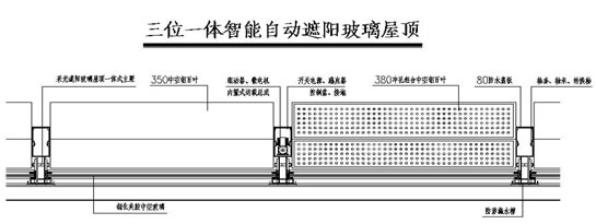 3.1這是在激烈競爭中應勢而生的一種現代建筑形態的,由單件分層安裝發展成系列集成產品“三位一體遮陽采光玻璃屋頂”。實現了擋風雨、遮陽調光、機電傳動與控制三位一體,一梁多用。結構嚴謹,整體性強,穩固可靠,省電、省力、省空間,維修操作衛生方便。從根本上改變了以往建筑配件單制分割,生產與施工脫節不協調,建造遮陽玻璃屋頂必須先完成玻璃屋面,在玻璃屋面上再做網形鋼架,在鋼架上外掛電機掰線拖拉。一個遮陽屋頂有三層結構,縱橫交叉的網式鋼架,搞衛生人得爬進去工作,尤其屋面滲漏或玻璃炸裂,非得拆掉大片鋼架和外掛百葉,造成實難修補,費工費時,又不得不為之尷尬場面,而這些都是不可避免的,從而減少了許多無謂躁雜、重復、浪費和煩惱。為建筑師盈得發揮技術空間,給設計施工提供方便,給用戶帶來實惠。