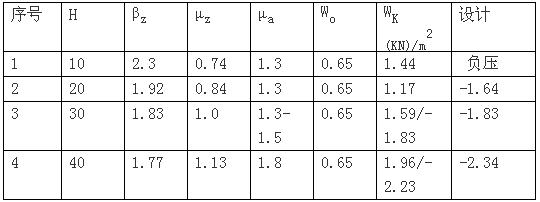 目前95%以上的幕墻公司在投標方案設計時,往往取H=40m,Wk1=1.96 KN/m2為標準值和Wk1=-2.34KN/m2設計值進剛度和強度計算的。 從表A中40m處,我們清楚看出框架式幕墻風壓標準值為1.86 KN/m2設計值為2.74 KN/m2;在高度為40m時,標準風壓值為1.96 KN/m2,設計值2.74KN/m2,H=40m,根據幕墻設計主要以剛度準則原則,即滿足各分高區段都滿足剛度。