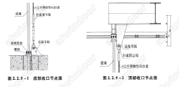 底部收口按常規應考慮到地面石材收口線,將豎向索的可調裝置安裝在豎向索的下端,以便在幕墻在使用狀態時對索的