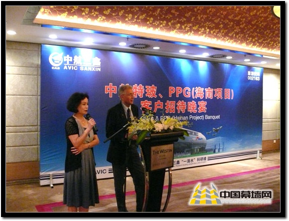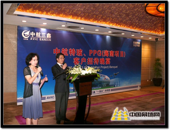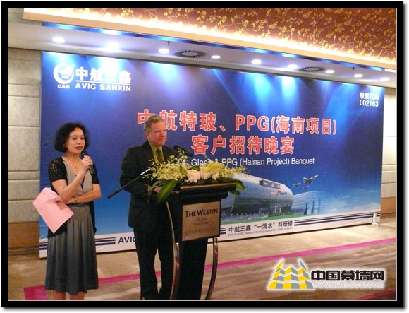 【中國幕墻網 06月25日消息 】6月4日晚,北京金茂威斯汀大飯店3樓朝陽廳笑聲朗朗,氣氛熱烈,中航三鑫海南中航特玻項目1#線投產, 海外客戶訂貨答謝會正在這里舉行。中航三鑫股份有限公司總裁、海南中航特玻公司董事長韓平元致答謝辭,美國PPG公司總監杰夫、美國HFT公司副總裁陳奮代表合作伙伴致辭,印度公司代表海外客戶講話,來自韓國新新公司、日本公司,印度公司、新加坡公司、歐洲、南美公司等海外客戶出席了答謝會。貴航集團公司副總經理、中航三鑫公司董事長余霄主持會議并講話。