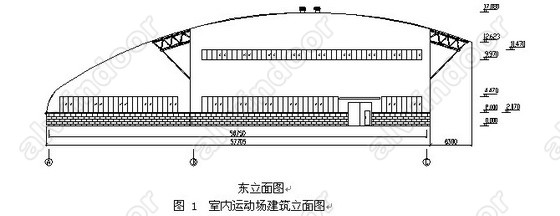 桁架結(jié)構(gòu);總建筑面積約3090m2,室內(nèi)建筑面積約2530 m2,平面建筑尺寸為長57.7m,寬52.9m,總高17.08m。本工程是在有所局限的地理位置上設(shè)計(jì)出有自己特色的建筑結(jié)構(gòu),其立面布置見圖1所示。