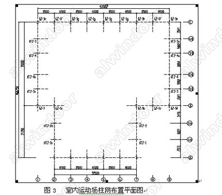 本工程所處的地理位置是廠舊鍋爐房拆遷后所剩下的一塊地方,周圍都是樓房或建筑物,為了充分利用現(xiàn)有的建筑空間,它的平面形狀已被確定,見圖2所示。建筑長度為57.7m,寬度為52.9m,因此就要求在有限的區(qū)域內(nèi)建造出符合各功能要求且具有現(xiàn)代外型的一個(gè)室內(nèi)綜合性運(yùn)動(dòng)場所。