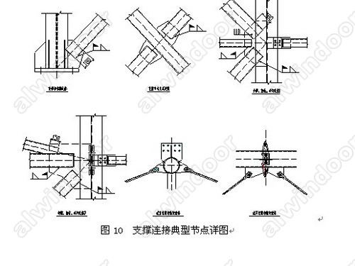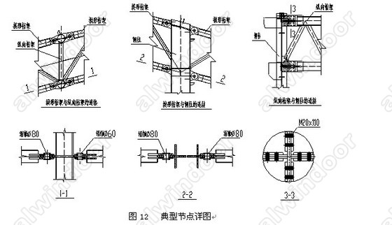 螺栓夾板固定,主拱型桁架上下弦桿與縱向桁架和鋼柱的連接采用