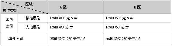——>光地展位: 光地展位費(fèi)用僅包括場(chǎng)地租賃費(fèi)。租賃光地的企業(yè)需自行搭建展臺(tái)并向展館另外支付施工管理費(fèi)、垃圾清運(yùn)費(fèi)等費(fèi)用。 ——>9㎡ 標(biāo)準(zhǔn)展位配置: ◆ 三面隔板(多開口的展位根據(jù)客戶要求自行決定) ◆ 一塊中英文楣板 ◆ 展位內(nèi)地毯 ◆ 三盞射燈 ◆ 一張咨詢桌 ◆ 一張洽談桌 ◆ 四把折椅 ◆ 一個(gè)廢紙簍 ◆ 1個(gè)5A/220V電源插座