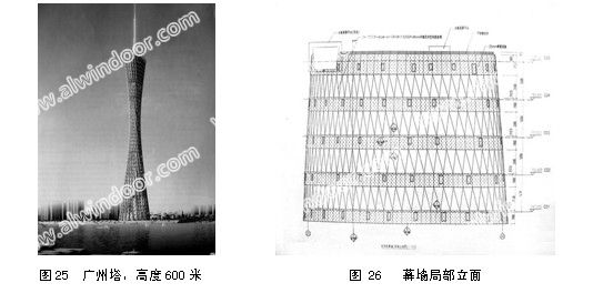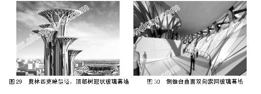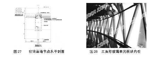 蜂窩鋁板單元。通過可變角度單元組合立柱,用平面板塊擬合橢圓形雙曲性拋物面。(圖25--圖29)。