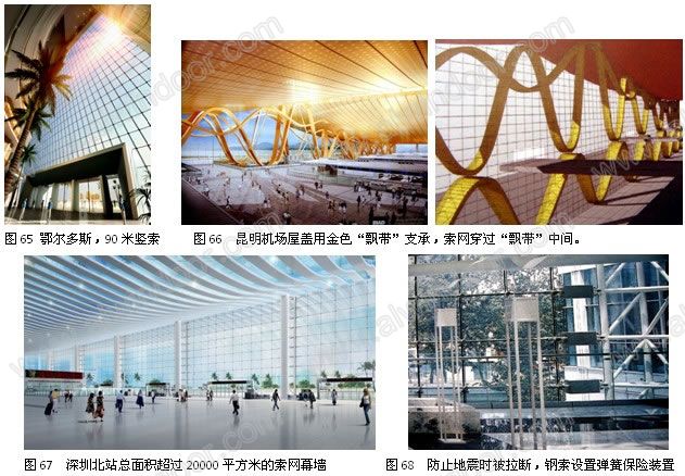 最近,超大規模的索網在大型公共建筑廣泛使用,其規模和技術難度在世界上都是前所未有的。圖65為鄂爾多斯賽馬場的超大單向索幕墻,高度達90米。昆明新機場索網幕墻面積達20000平方米,更困難的是鋼索都必須從彎曲的鋼“飄帶”的中間穿過(圖66)。京深港高鐵深圳北站的索網幕墻總面積也超過了20000平方米,為此還進行了整片實大幕墻的施工模擬試驗(圖67)。