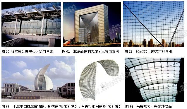 索網結構通常是雙向布置張拉鋼索。當跨度不超過15米時,幕墻也可以沿豎向單向布索,采光頂可以沿短向布索。索網是技術含量較高的結構系統,其設計涉及大撓度下的非線性(詞條“非線性”由行業大百科提供)結構分析,而且要考慮溫度和初拉力的影響;其施工則要考慮預拉力的合理張拉分級和順序,復雜程度較高。國內最早的拉索幕墻是哈爾濱國際會展中心(圖60)。目前最大的單張索網是北京新保利大廈,90米X70米,三棱面(圖61、圖62)。上海中國航海博物館采用了兩張54米高的馬鞍形索網(圖63),張拉在高度為78米的鋼骨混凝土“船帆”上。馬鞍形索網還用于采光頂屋面(圖64)。