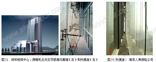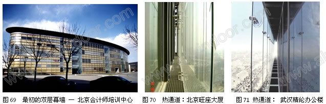 雙層通風幕墻由外幕墻、內幕墻或門窗以及它們之間的熱通道(詞條“熱通道”由行業大百科提供)構成。用自然通風或機械通風在熱通道形成穩定的氣流,改善室內環境,有時還可以降低取暖和空調的能耗。我國最早的雙層通風幕墻是北京會計師培訓中心(圖69)。此后各地陸續建造了許多工程,同時也在探索這項新技術的合理應用途徑(圖69~圖74)。