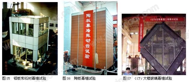 振動臺試驗是研究幕墻抗震性能最直觀、最真實的試驗方法。我國最大的振動臺臺面已經達到6米X 6米,載重60噸。進行過很多幕墻的振動臺試驗,其中包括幕墻的形式實驗和對特定工程項目的幕墻試驗(圖85~圖87)。