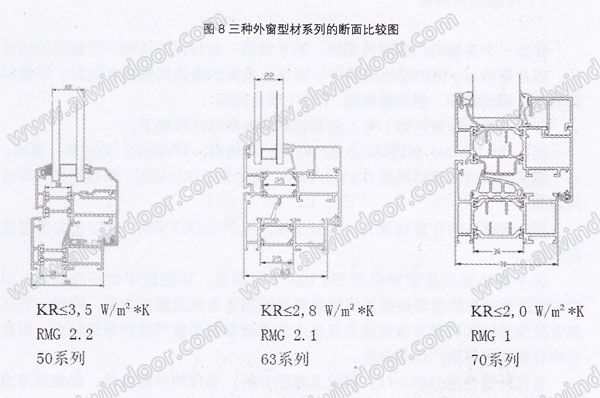 其次,對于斷橋鋁合金的型材來講,多腔體的型材結構及連續性的隔熱設計,對于提高門窗的隔熱起到決定性作用。通過圖7三種系列型材,即70系列與5O及63系列的腔體比較,7O系列具備多腔體結構設計與連續性隔熱設計的特點,因此具有較好的隔熱效果。