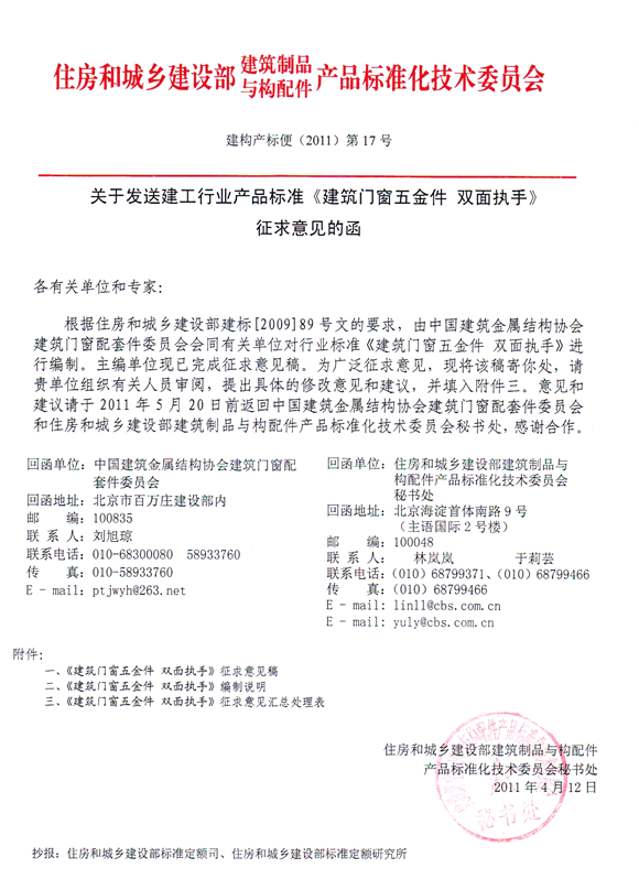 關于發送建工行業產品標準《建筑門窗五金件雙面執手》征求意見的函