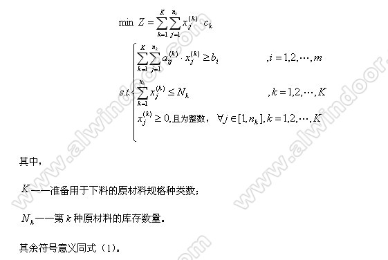 在非定長優化下料階段,每種切割方式中最多零件種類數和最少原材料定購數量的限制,會導致部分零件未下完,這部分零件的下料,以高原材料利用率為目標,按定長原材優化下料問題處理。其數學模型如下式描述。