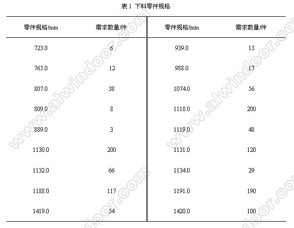鋁合金型材進行下料:表1是待下料零件規格與數量,切割料縫為5 mm。表2是采用國863/CIMS目標產品“建筑