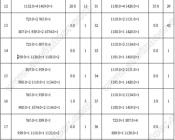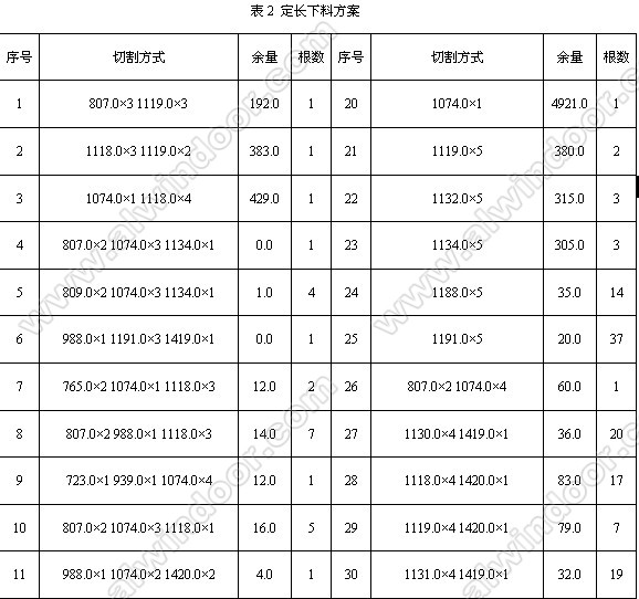 金屬(詞條“金屬”由行業大百科提供)結構計算機輔助設計與生產管理集成系統”中的條材優化下料子系統按定長原材料6000 mm得到的切割方案。表3、4分別是采用本文下料方法編制的優化下料程序非定長處理階段和定長處理階段得到的切割方案。其中原材料定購尺寸區間為3000 mm~6000 mm,定購尺寸步長為300 mm,原材料最少定購數量為6支,每種切割方式中零件套裁種類數量限制為1。