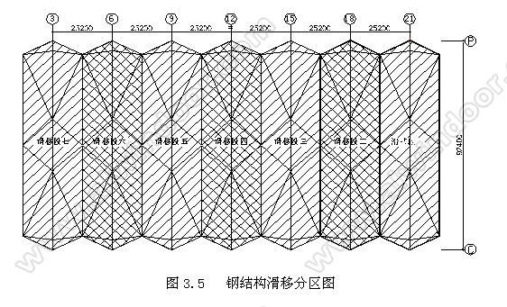 本工程的施工重點是各種規格的三角形鋼架的安裝工作,尤其是屋面部分三角形次龍骨鋼架的安裝工作。為此本工程屋面次結構的安裝采用三角鋼架高空拼裝,與主體鋼結構同步累計滑移。經過受力計算在臺架上增加支撐,在鋼結構滑移分區圖中每個單元的次結構增加重量不超過27噸的情況下,可保證與主體鋼結構安全同步滑移(如圖3.5)。